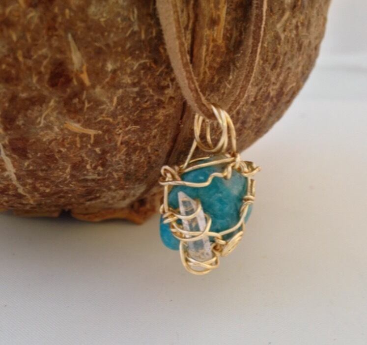 アマゾナイトをメインに水晶原石を添えて巻き上げました。