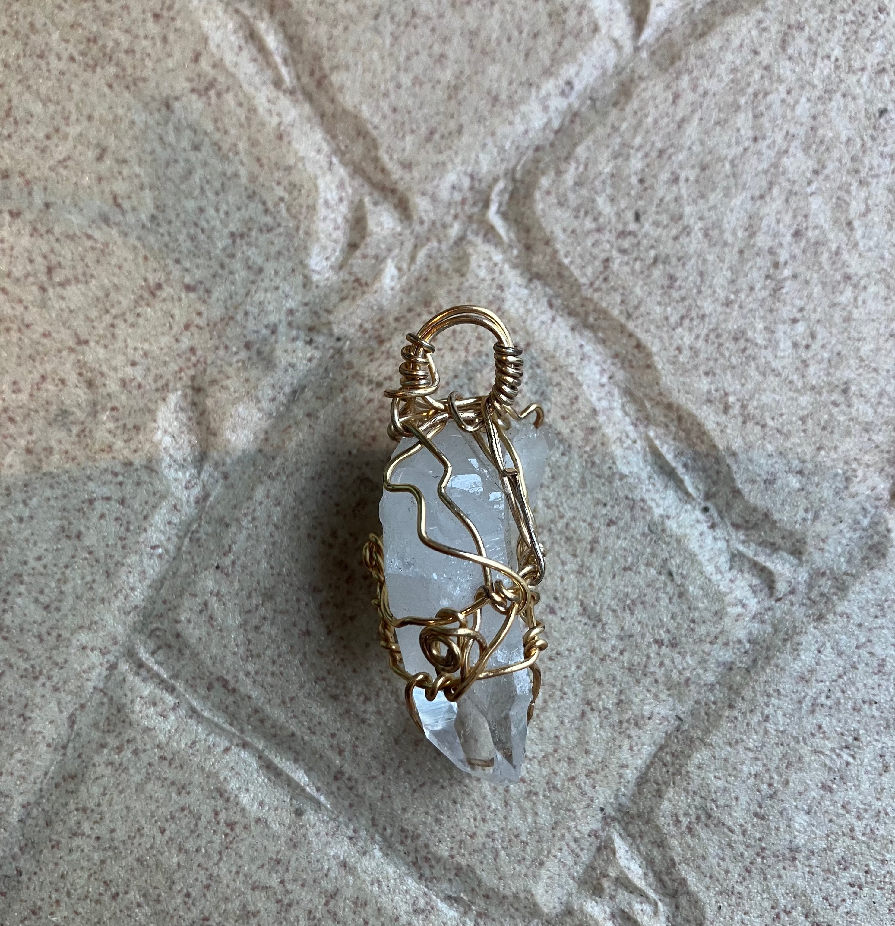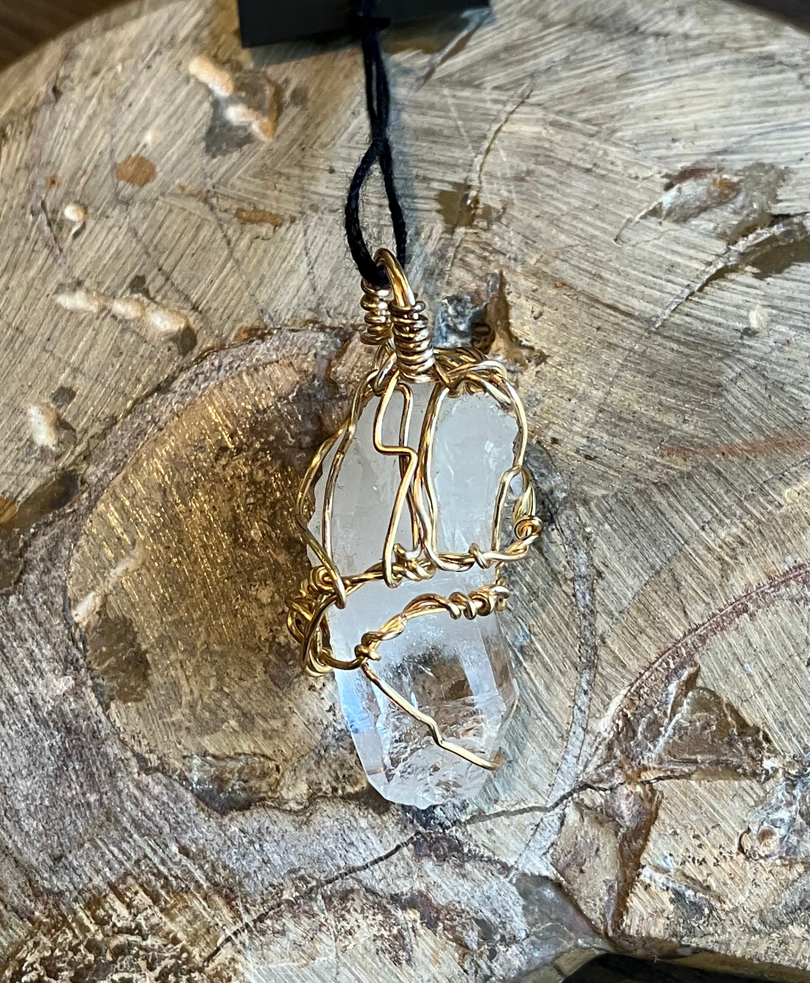 こちらは水晶の原石を1から手巻きでお作りした世界に一つしか存在しないペンダント。